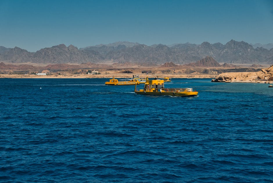 Yellow boats float on the vibrant blue waters of Ras Mohammed with scenic Egyptian mountains in the background.