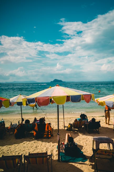 Relaxing scene at Phuket beach with colorful umbrellas and people enjoying the sun and sea.
